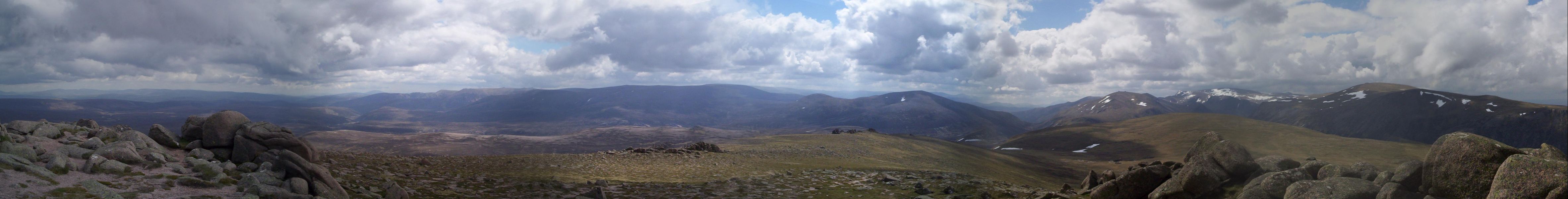 From left to right we can see Glen Avon which flows down towards Tomintoul, with Ben Avon in the background. Further round to the right is the pass at Lairig an Laoigh and then the snow covered hills of Derry Cairngorm, Ben Macdui and Cairngorm