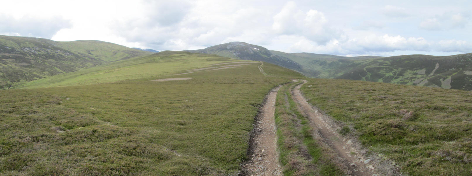 The OS 1:25000 map shows a broad track ending at NO 061 815 but, in actual fact, it seems that more grouse butts have been built and it has been extended further uphill towards Carn Bhac.