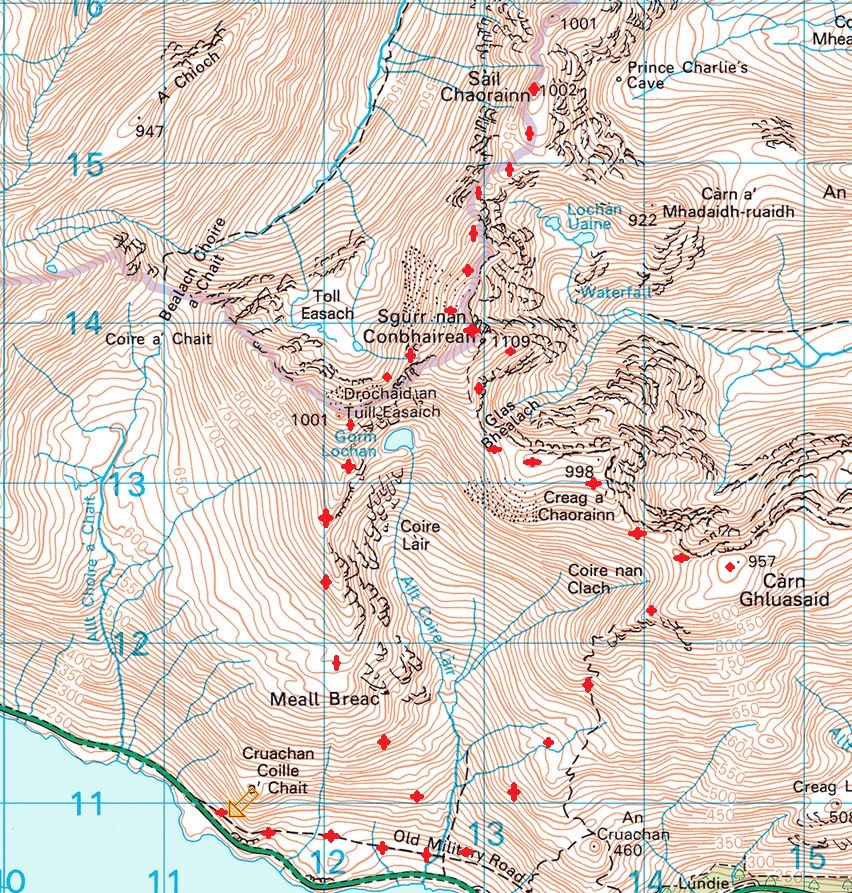 I'd climb Meal Breac, go over Droichaid an Tuill Easaich, take the avoiding path around Sgurr nan Conbhairean and on to Sail Chaorainn before returning over Sgurr nan Conbhairean to Carn Ghluasaid.