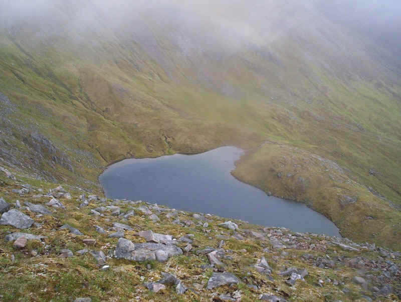 The path doesn't actually go over the summit of Droichaid an Tuill Easaich but skirts the hillside with this dramatic view of Gorm Lochain far below in the corrie; it's a long way down and I was careful where I put my feet!