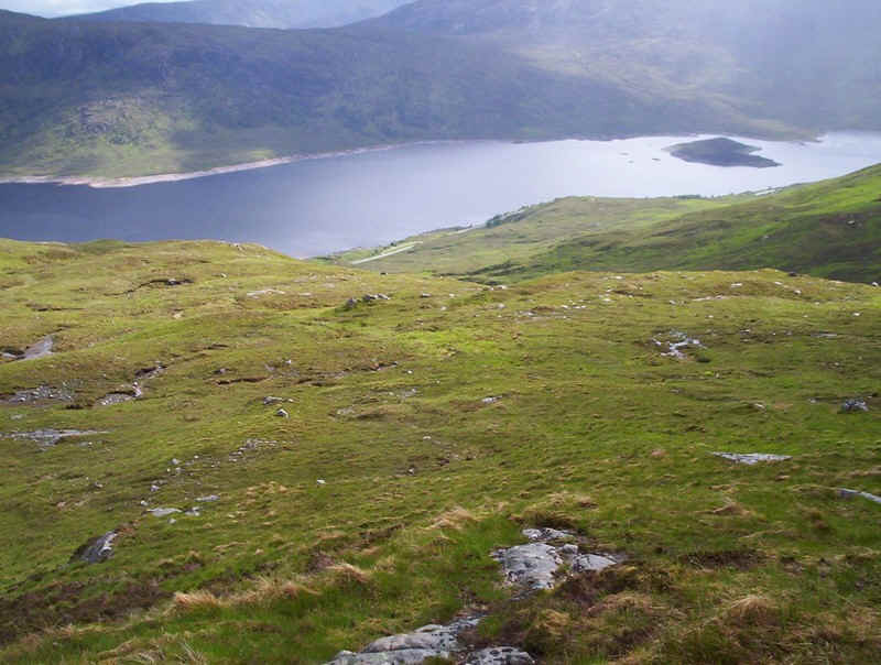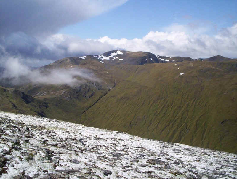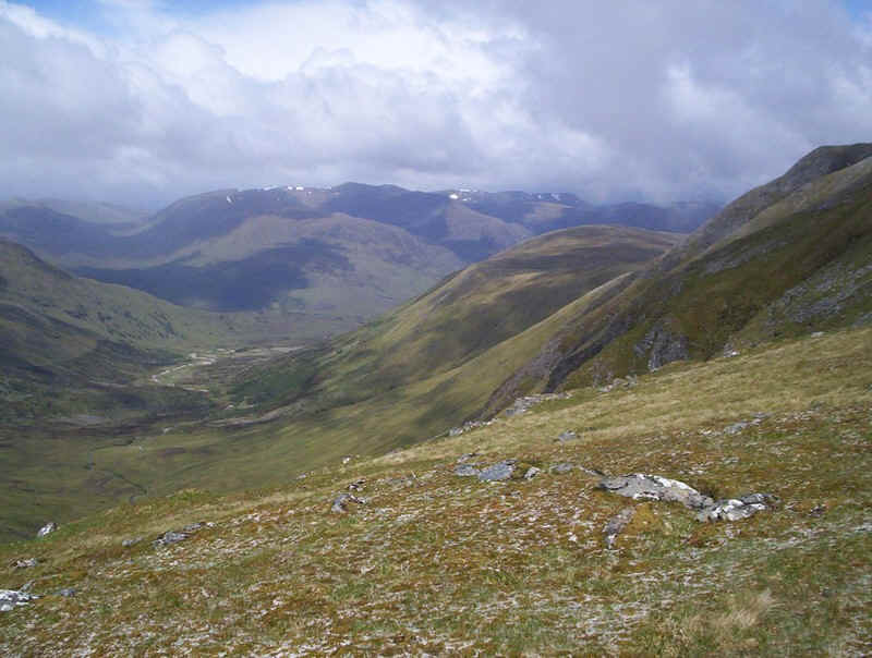 I suspect getting down from Sgurr nan Conbhairean could be confusing in mist as there are ridges in three directions all of which are over similar stony terrain. Here I'm going down the south west ridge to Glas Bhealach.