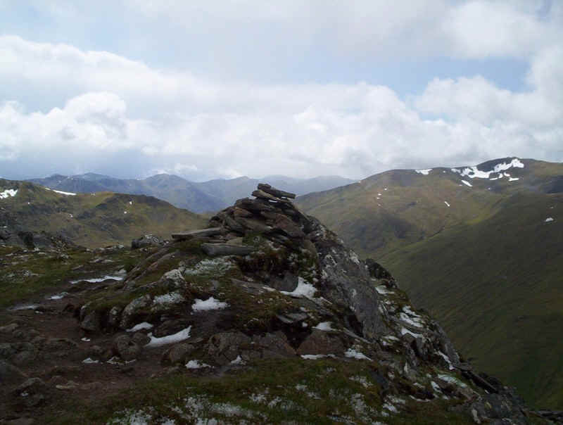 The summit cairn of Sgurr nan Conbhairean (1109m) and the only cairn in my four day's walking that had a proper wind shelter in it. It had me less than an hour from Sail Chaorain to reach this summit and I sat out another squall protected by the shelter.