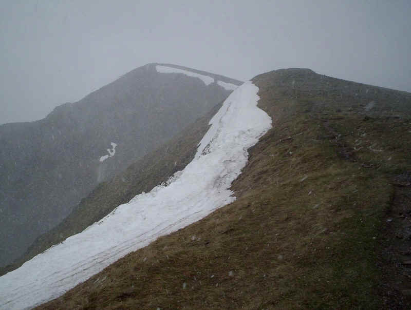 By now the weather was changing with frequent snow showers and cloud drifting in and out. The photo shows the path ascending the ridge to Droichaid an Tuill Easaich, on the left, with Sgurr nan Conbhairean on the right.