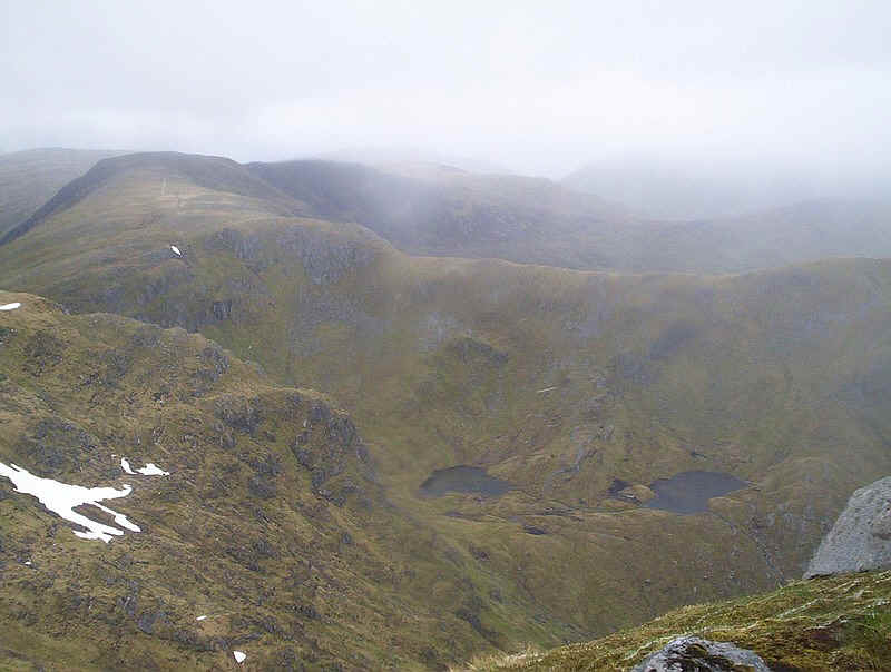The two lochans in Coire nan Lochan Uaine seen from the summit of Sgurr nan Conbhairean