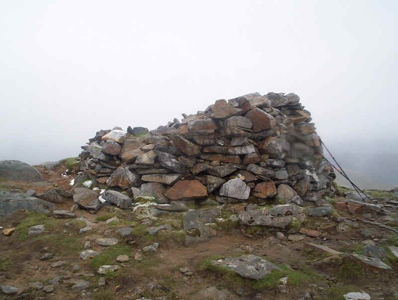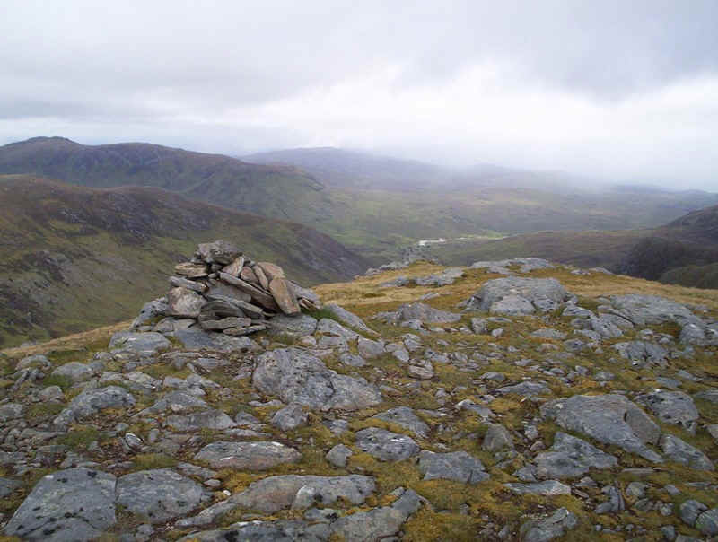 The last Munro of the day, Carn Ghluasaid, and its cairn ((957m) with Sgurr nan Conbhairean behind in the mist.