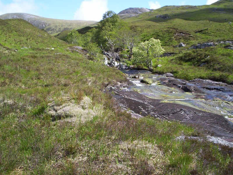 A glance at the map revealed that if I walked upstream I'd come to the ridge that led to my intended return route over Meall Breac. I decided, therefore, to reverse my intended route.