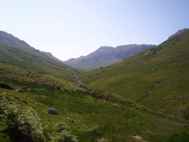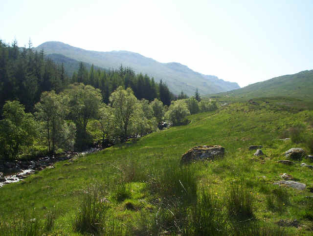 I've left the main path and I'm dropping down into Coire Earb. Beinn Tulaichean rises above. The trackless route over notch between Stob Glas and Cruach Ardrain proves easy and before long I'm heading down the slopes to the river Falloch.