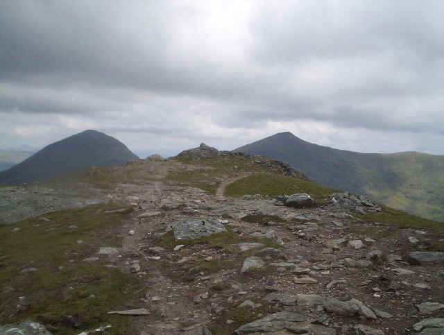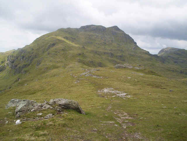 Cruach Ardrain from the summit of Meall Dhamh. My wife and I had got as far as this in October 1999 on our first visit to Crianlarich. It was here that we realised that we couldn't go any further because of snow and ice. the path drops down from Meall Dhamh to a bealach before traversing to the right of the hill to a point near the notched rocks on the right. It then turns and approaches the summit round the back.