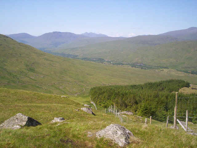 There's a vague path that runs up by the side of the deer fence along the edge of the plantation on Hawk Crag. in the background is Glen Falloch towards Ardlui.