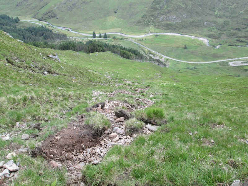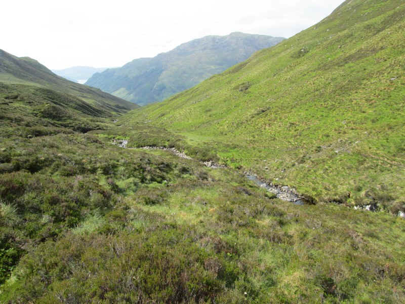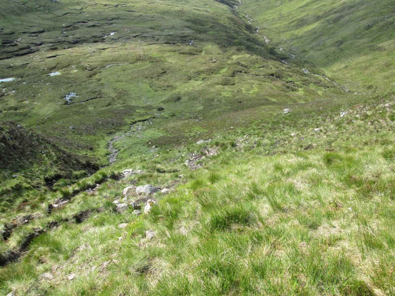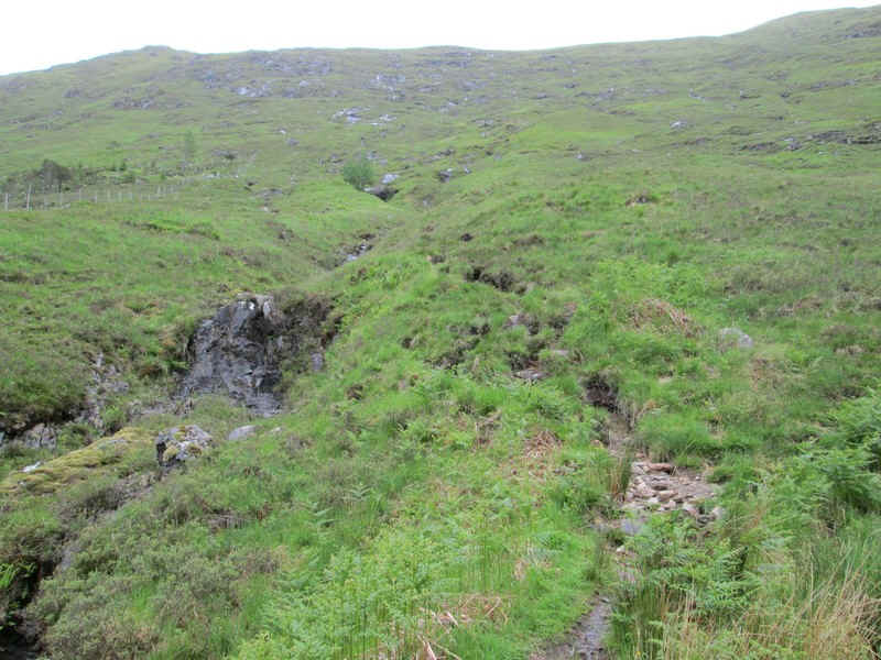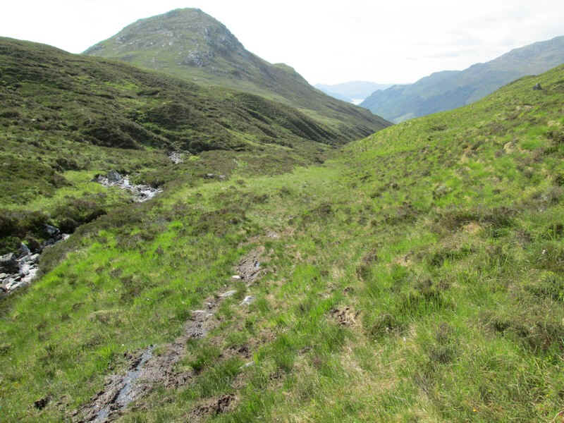 As the ground steepens, the track heads towards the Allt a'Chruinn and becomes less distinct. Luckily there's no need to cope with the bog ahead.