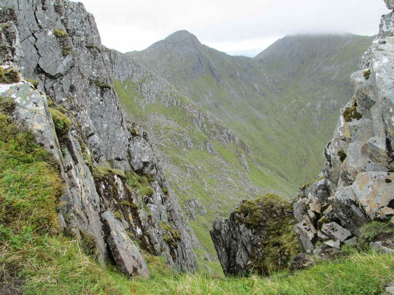 The path passes this cleft with views of Sgurr na Carnach and Sgurr Fhuaran (under the cloud)...