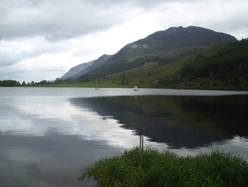 The waters of the loch are still and reflect Meall nan Dearcag.