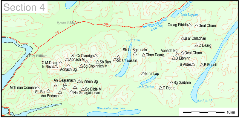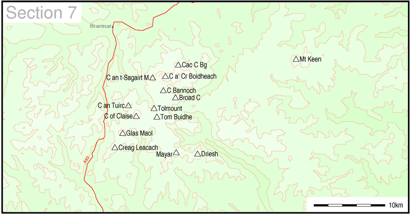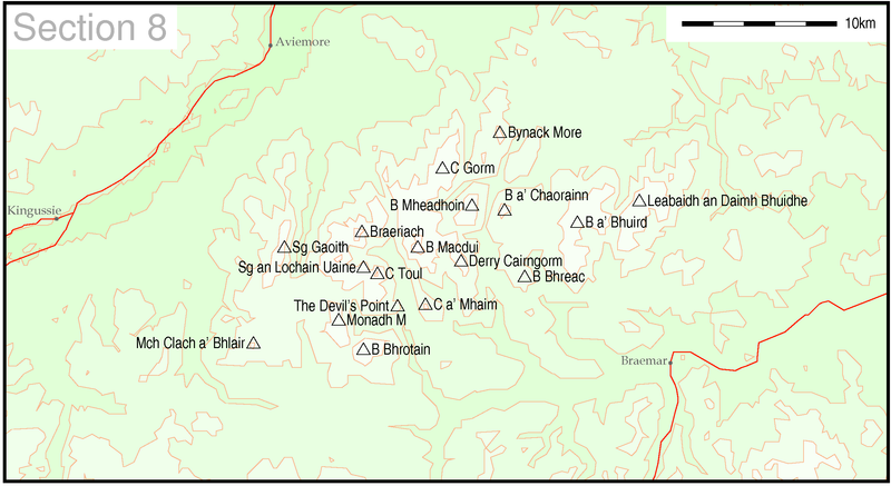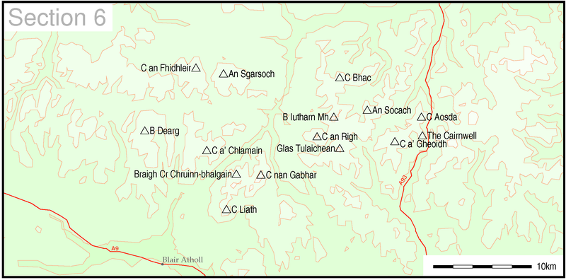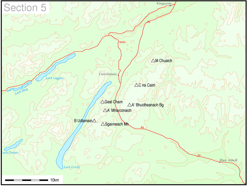 The morning bus from Inverness arrives at Braemore Junction at 09.11 and the return leaves at 1658, which gives about 7h 30 min for the walk, allowing a little leeway. The 12km road walk will need about 2h 30min which leaves about 5 hours for the hills. By tackling these hills in two or three expeditions it should be possible to bag them all.