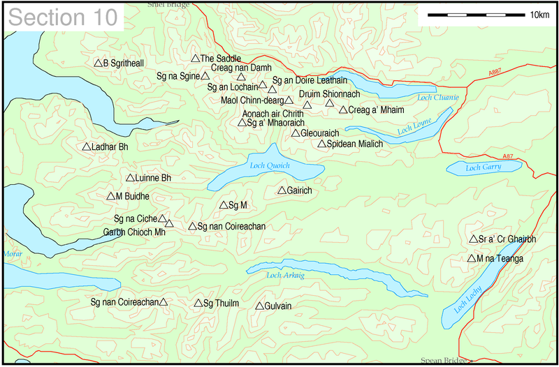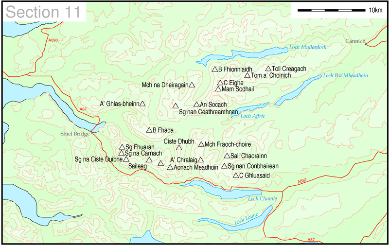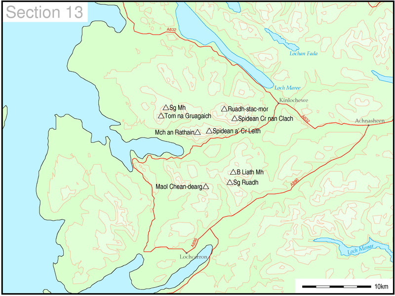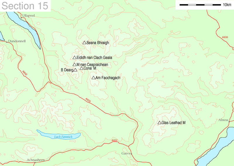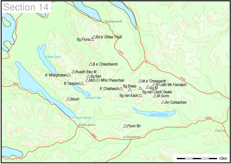 These hills are climbed from Inverael on the A835 at the head of Loch Broom. The Inverness to Ullapool bus passes Inverlael and might stop there. The return time from Inverael is just under 8 hours. The problem is now how to get back to civilisation. The only escape route would be along the A835 to Ullapool. This does not look, at least on the map, to be a particularly safe or pleasant route and is 10km long.