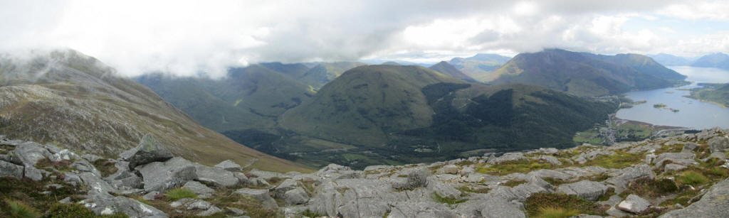 A panoramic image looking from the summit. To the left is the neighbouring Munro Sgorr nam Fiannaidh whilst, over to the right, are the two Munros above Ballachulish Sgorr Dhearg and Sgorr Dhonuill.