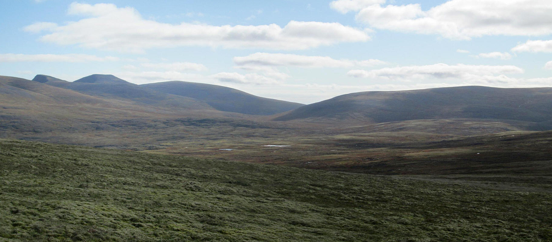 Another clickable panorama looking across the Moine Mor (Great Moss) towards the three Munros of Sgor an Lochain Uaine, Cairn Toul and Monadh Mor.