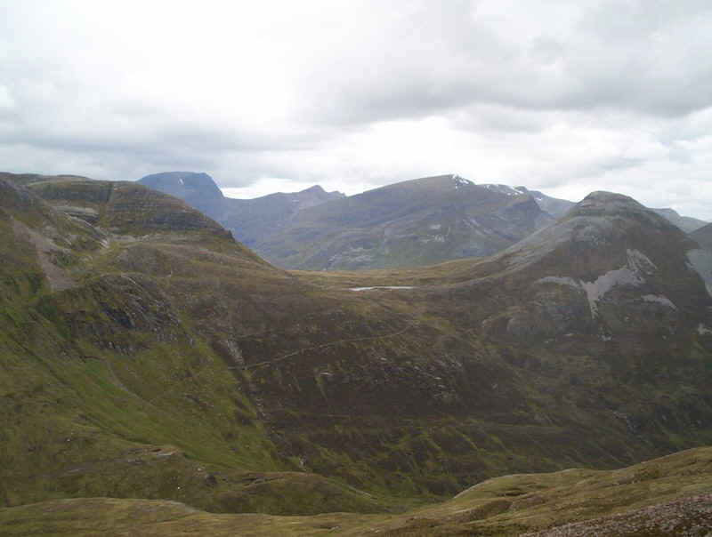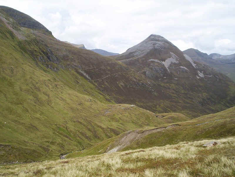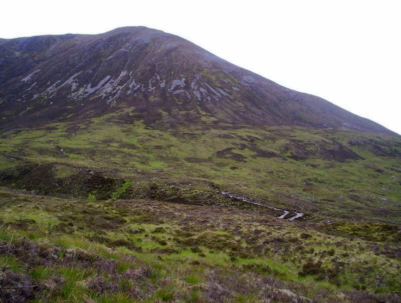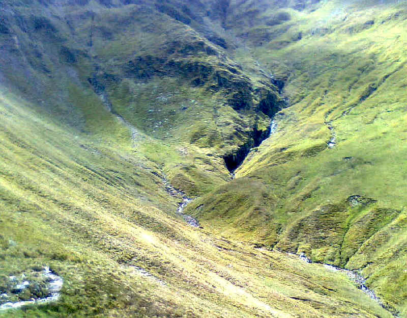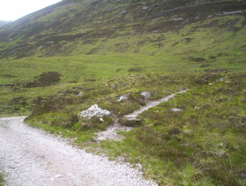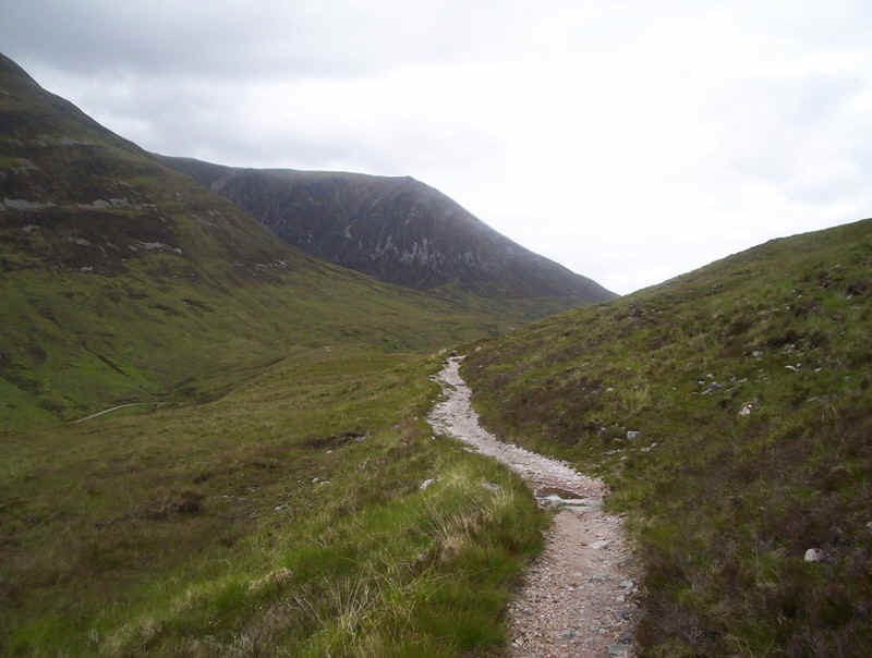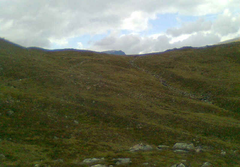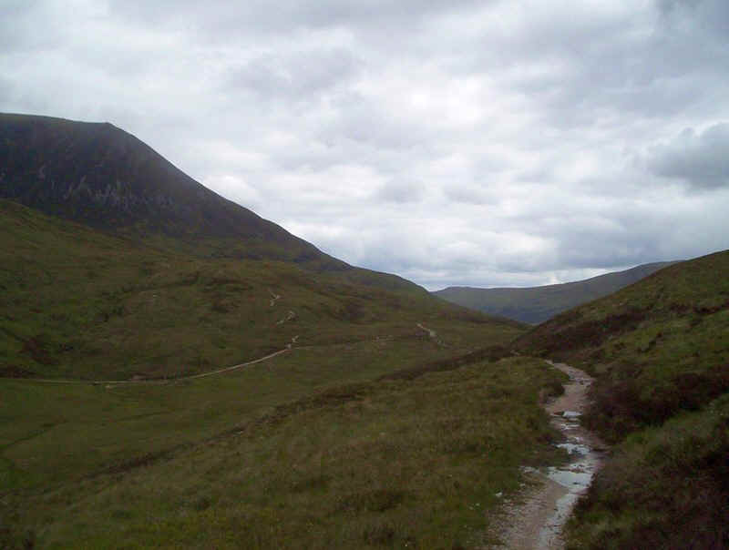 ......with the land rover track from Mamore Lodge visible on the left and the beginnings of the path up into the hills above it. The slopes of Sgor Eilde Beag tower above the valley.