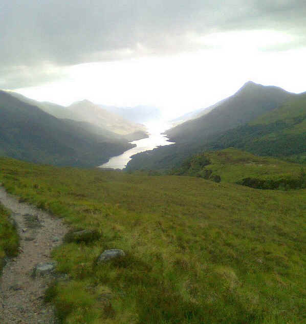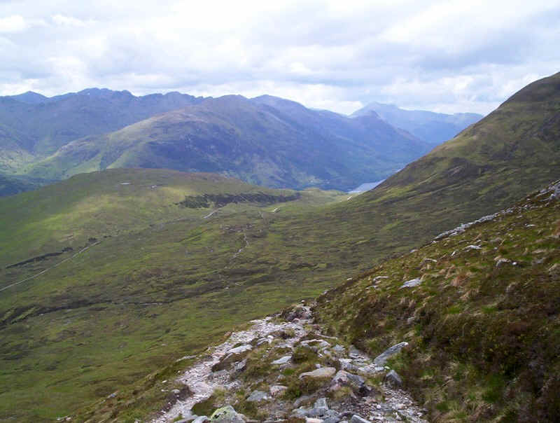 A marvellous clear view back along Loch Leven shows the pointed Pap of Glencoe to the left and Mam na Gualainn on the right.