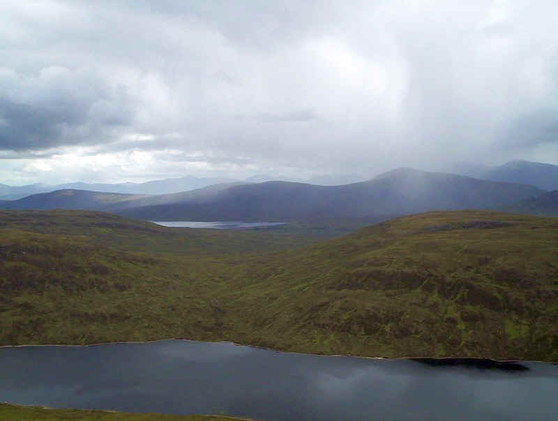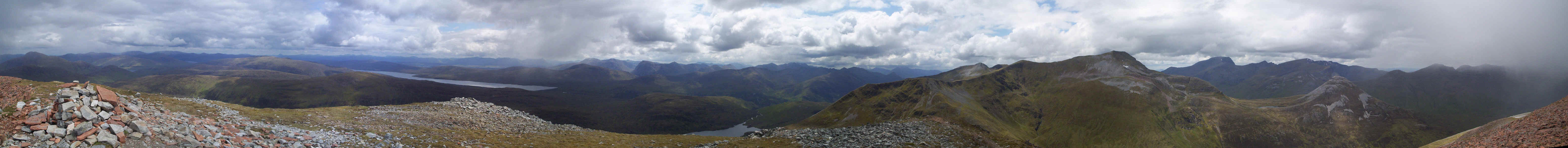 This is a complete 360 degree panorama from the summit. From left to right: Stob Coire Easain, Loch Trieg, the Blackwater reservoir, the Glencoe hills, Binnein Beag, Ben Nevis and the Aonachs and, under the rain shower, the Grey Corries. The next hill I wanted to climb was Binnein Beag, the small pointed one in the right foreground.