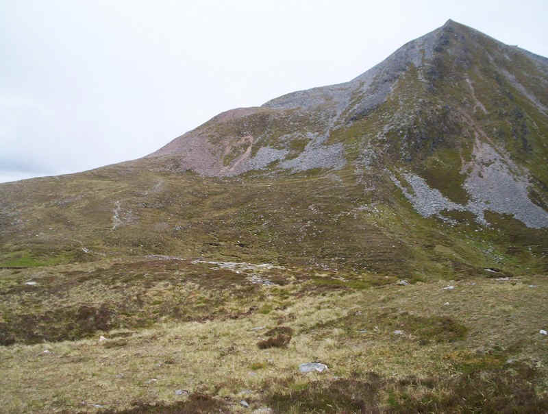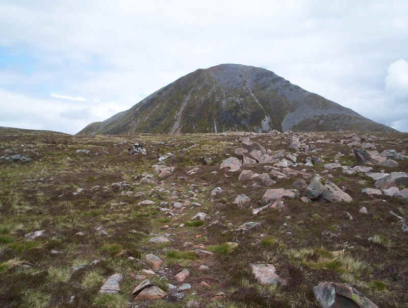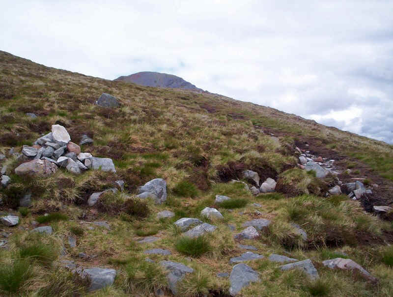 Eventually, the tip of Sgurr Eilde Mor came into view. There's a cairn here where the stalkers path zig zags uphill. I used this on my return but decided to continue on a hiker's path which climbs over peaty and stony ground...