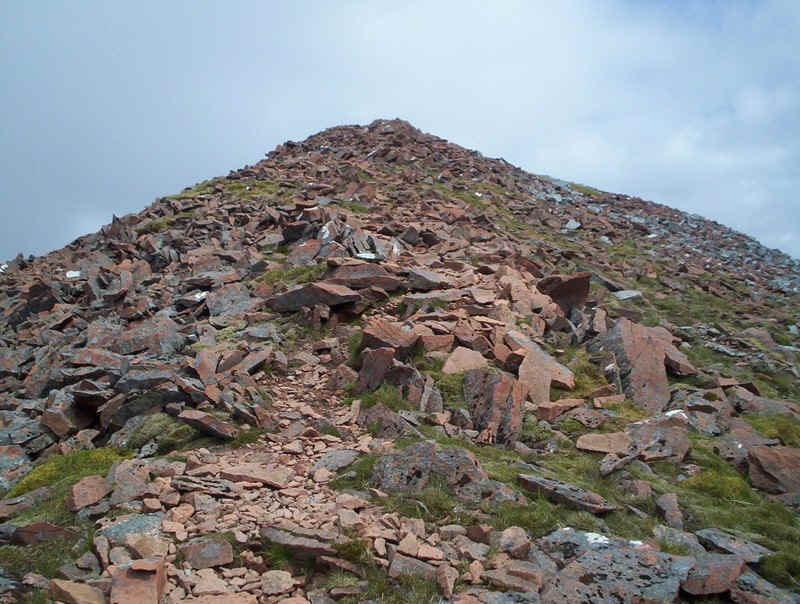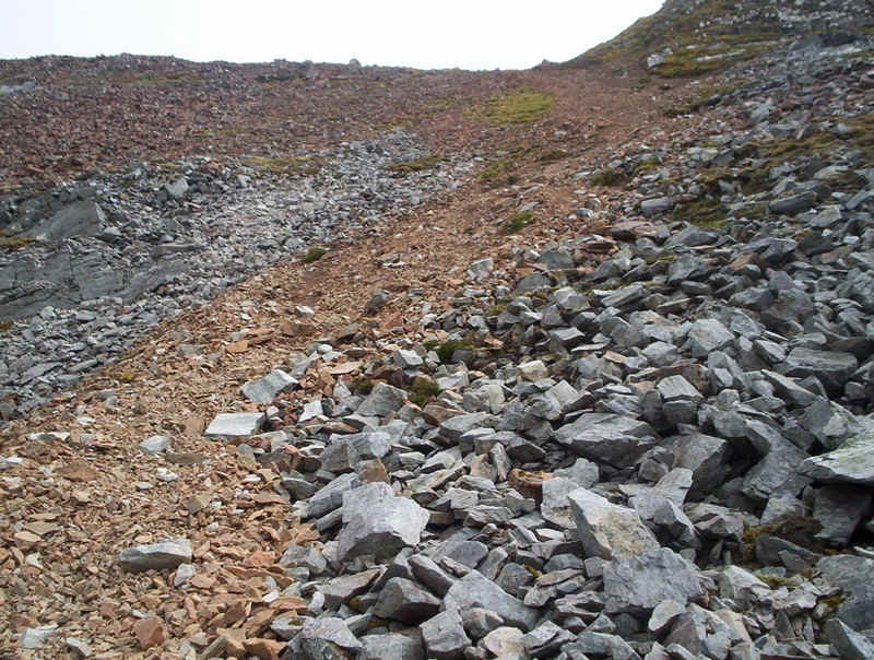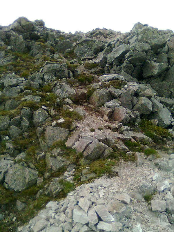 The scree path suddenly ends and there's a track over the stones towards the summit up the narrow ridge.