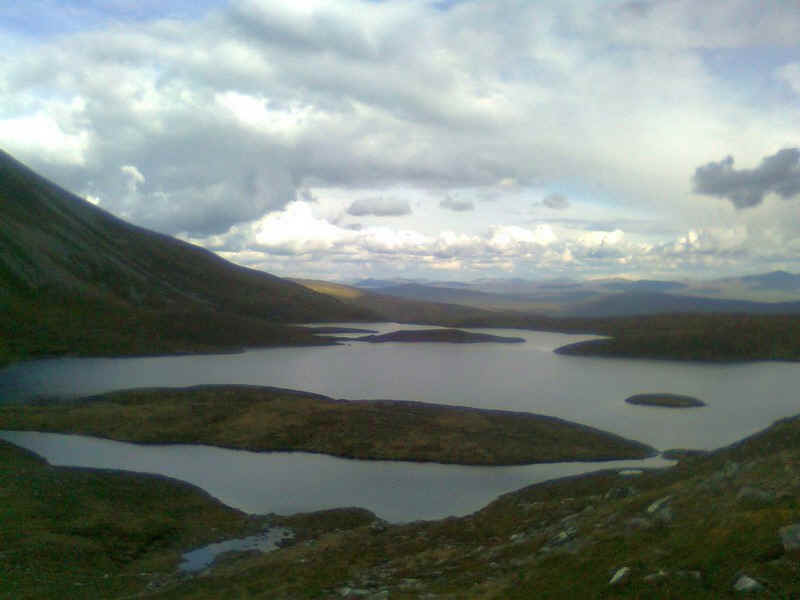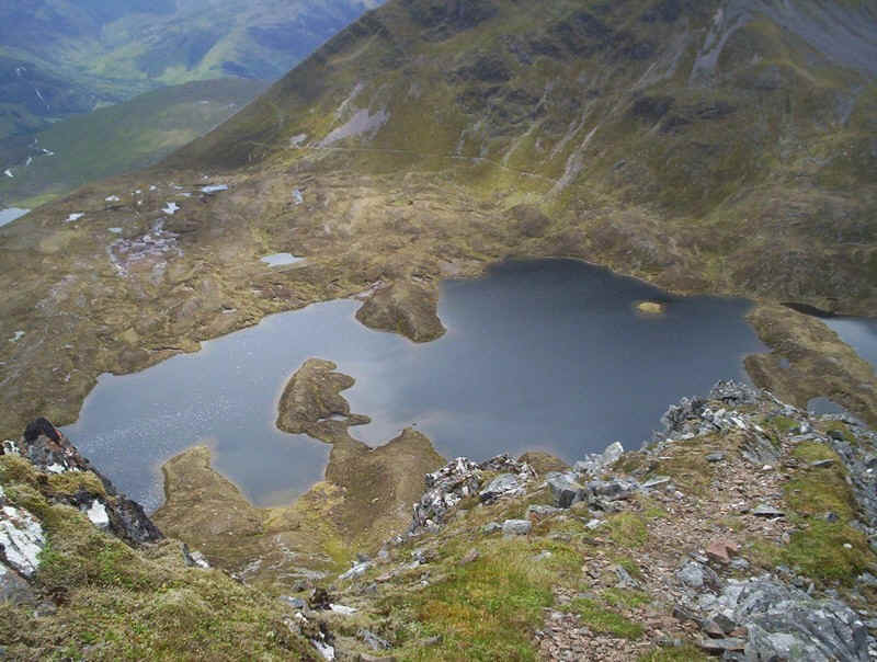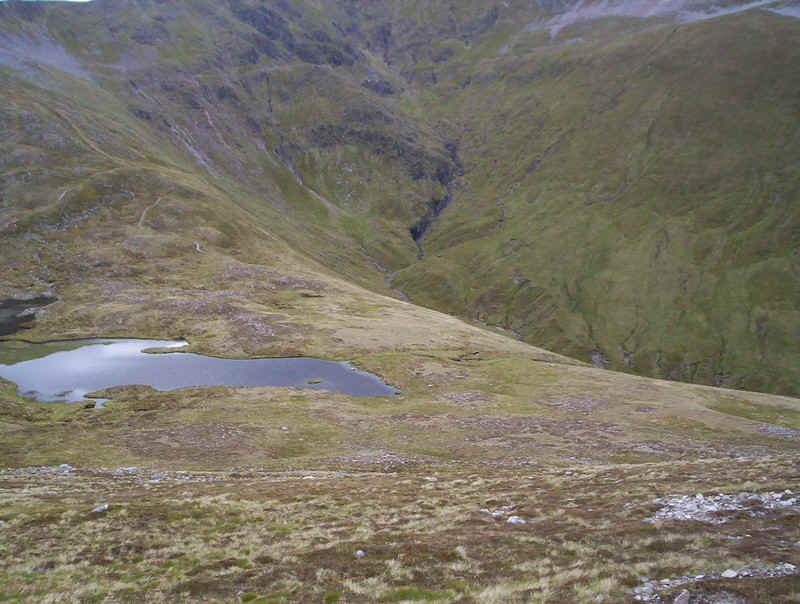 Just before the crest of the scree slope there is a clear, almost level track that leads to this sheer drop down into the corrie. It gives a "helicopter" view of the lochain but I wouldn't like to be there in misty or windy weather!