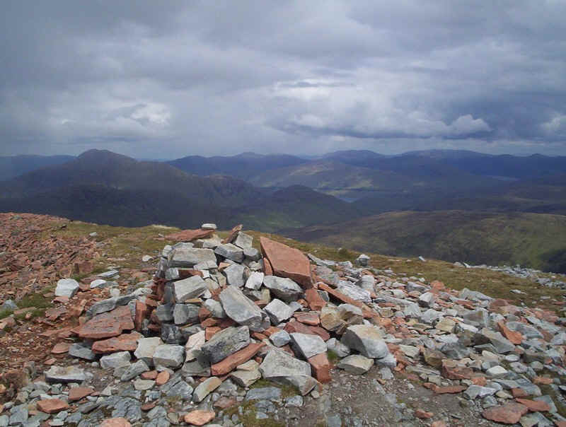 The summit cairn of Binnein Beag with Ben Nevis beyond....