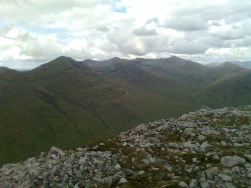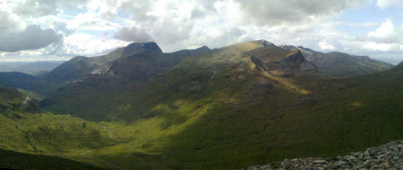 To the north is this panorama of the Mamores; Sgurr Fhuarain, Am Bodach and Na Gruagaichean.