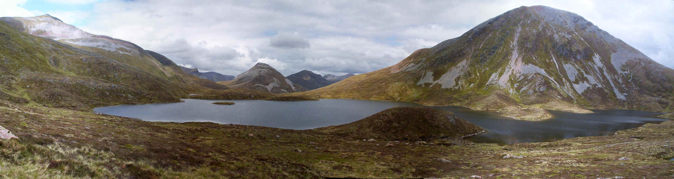 A panorama of Coire and Lochain with three of the Mamores Munros in view; Binnein Mor on the left, the pointed Binnein Beag in the middle and Sgurr Eilde Mor, my first target, on the right.