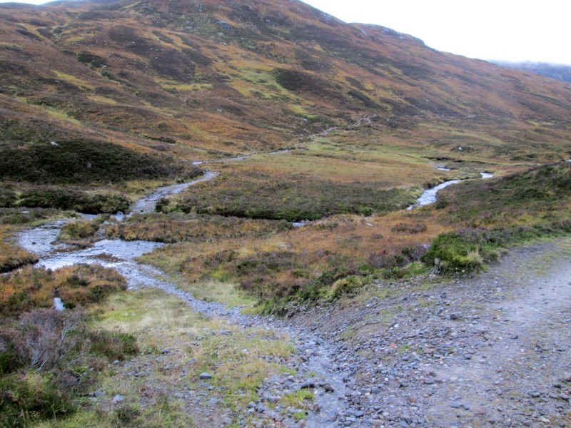 Crossing the Bealach na Cruaiche; the stream on the northern side flows directly into the River Spean, whilst the one heading south goes in to Loch Treig and then the very short (2 mile long) River Treig which also flows into the River Spean.