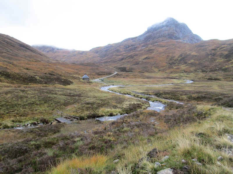 Looking back to the footbridge and bothy with Sgurr Inse (809m) beyond.