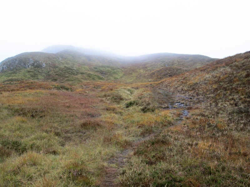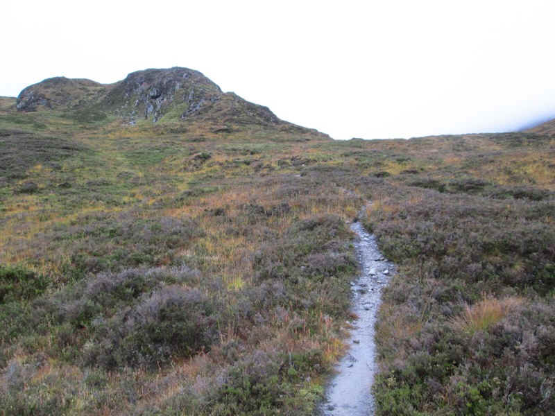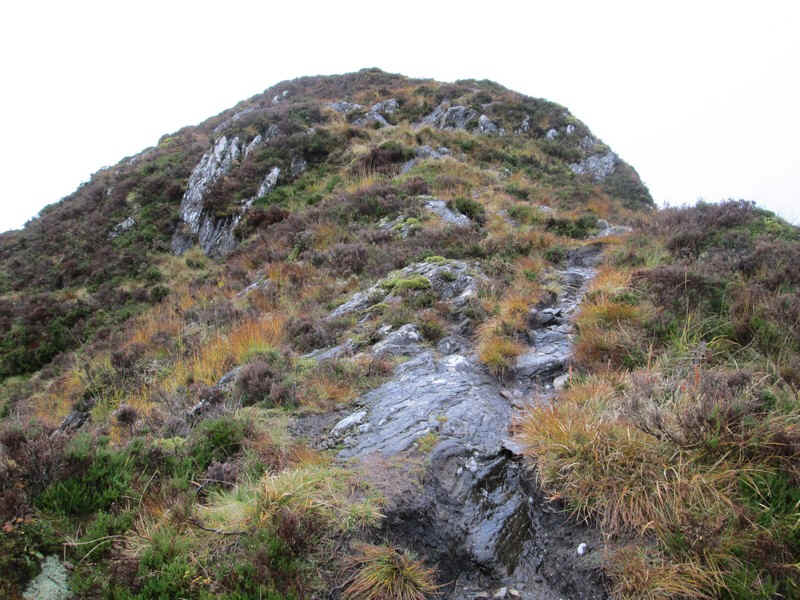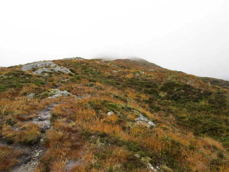 ...until it leaves the crest for a short distance to skirt the hillside above Coire Claurigh (down there in the mist).