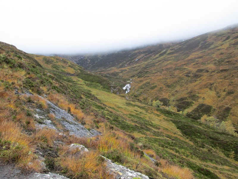 This view is looking up the Allt a' Chuil Choirean. Under the clouds is the col between Stob Choire Claurigh and Stob Ban.