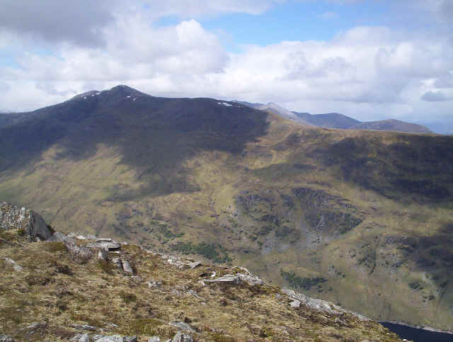Seen from the summit of Stob Coire Sgriodain, Stob a'Choire Mheadhain towers above Loch Treig