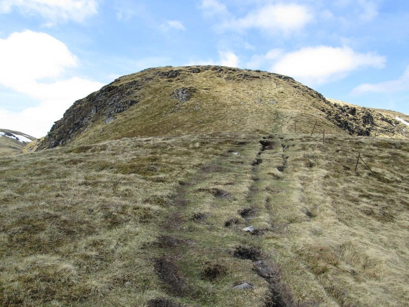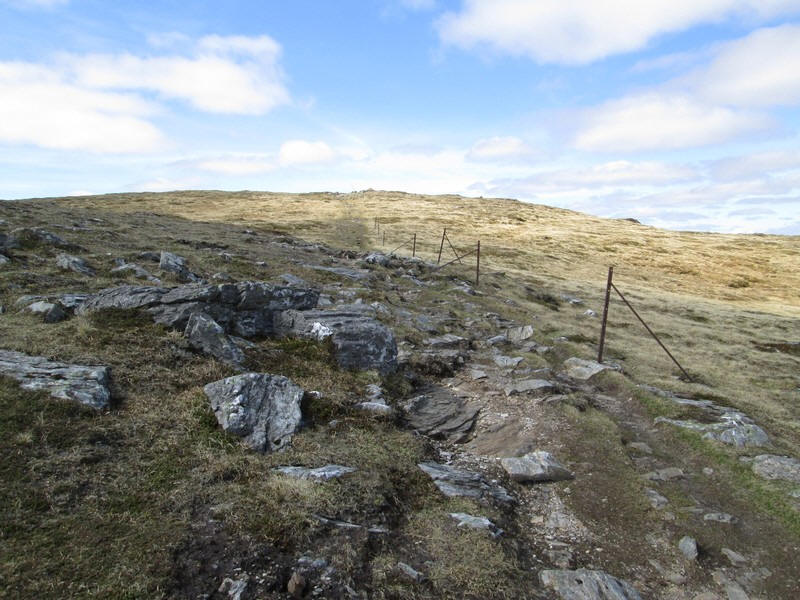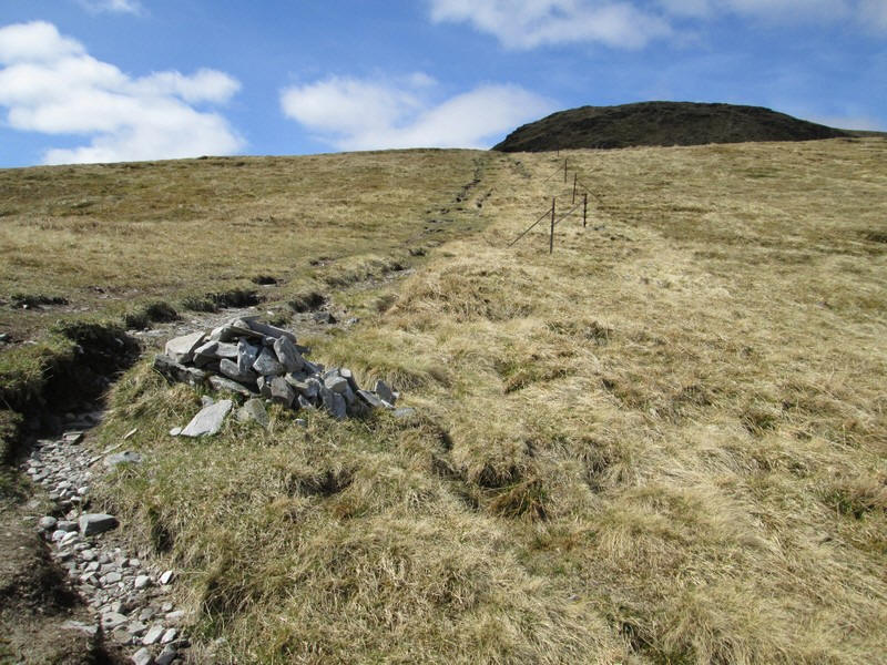 The steep climb ends at this cairn (at about the 800m contour) where the track crosses the line of fence posts.