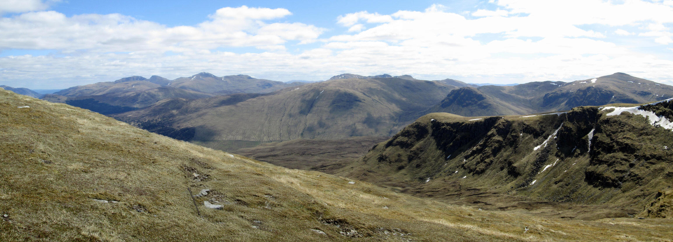 To the south west the end of Loch Lyon can just be seen with Ben Shearsgarnaich above it and to the left Ben Challum