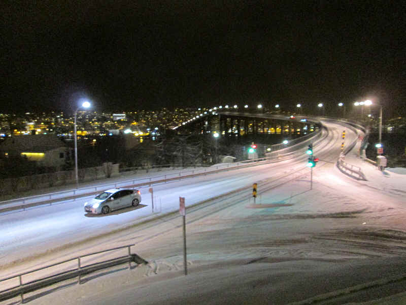 The view from the ship at 16:15. This is looking across the fjord between the island on which Tromsø is situated and the mainland, with the lights of the road bridge high above the water.
