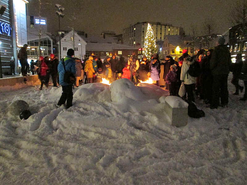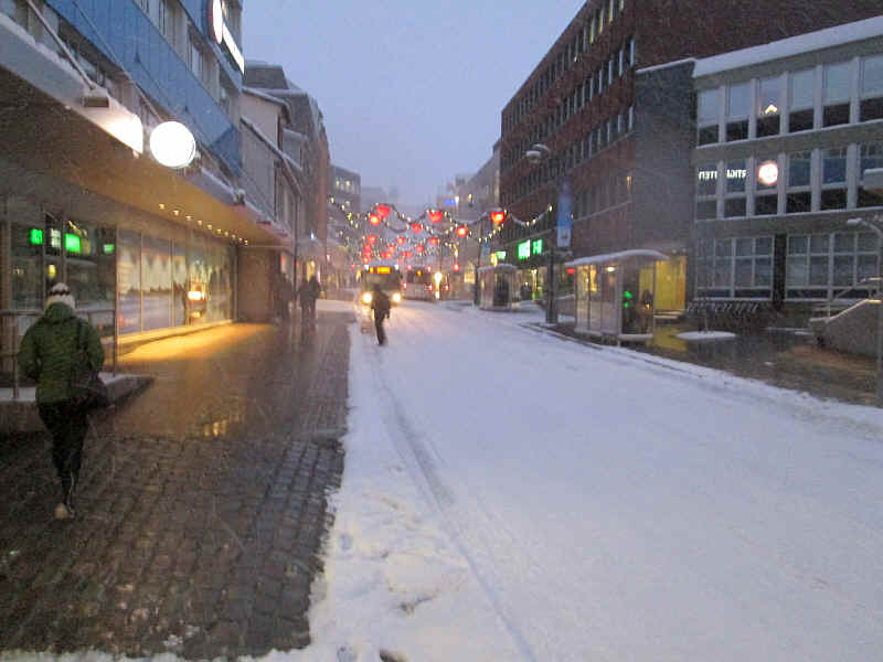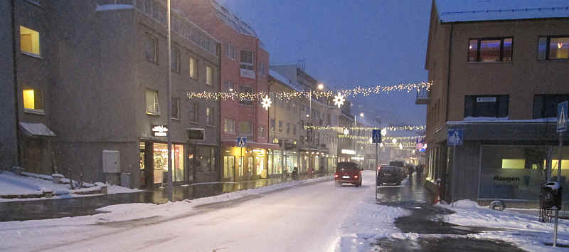 By chance this Sunday was the day of the Santa Lucia procession in towns and cities all over Scandinavia. Here Saint Lucy is about to start her donkey ride through the town. Now this is not Britain, so the procession shared the streets with cars and buses with not a policeman or road closure in sight. The children carried lit torches and as far as we could see nobody was incinerated.