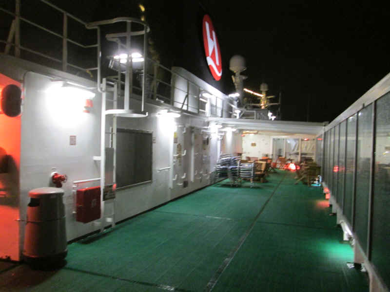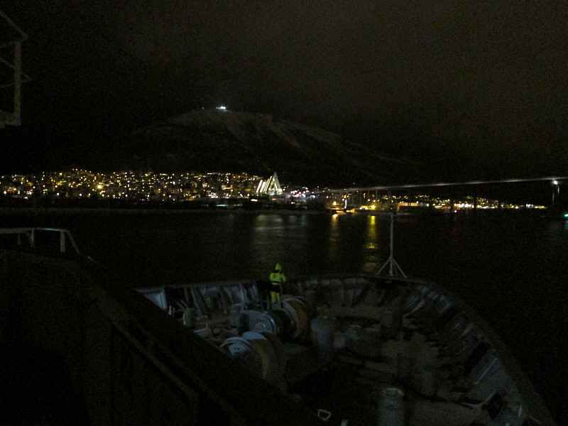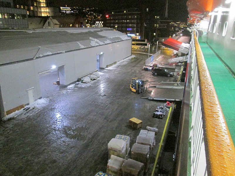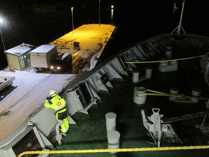 One of the good things about the 'Nordlys' is that there is a passenger walk way all the way round the ship including one under the bridge. In this view the crew are starting the process of loosening the mooring ropes.
