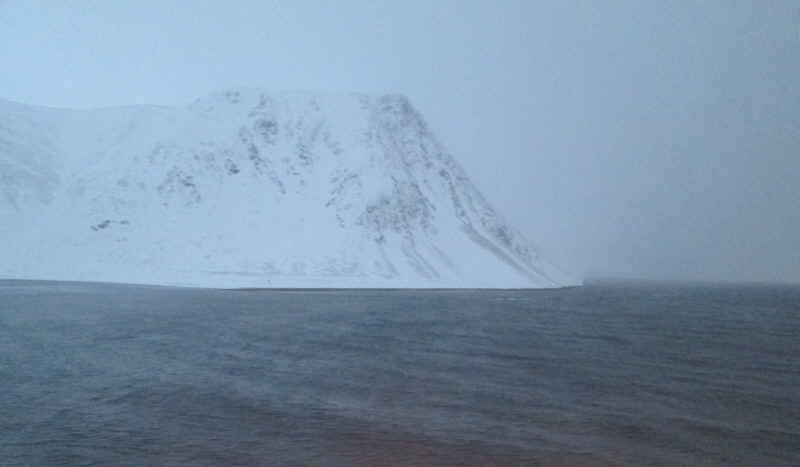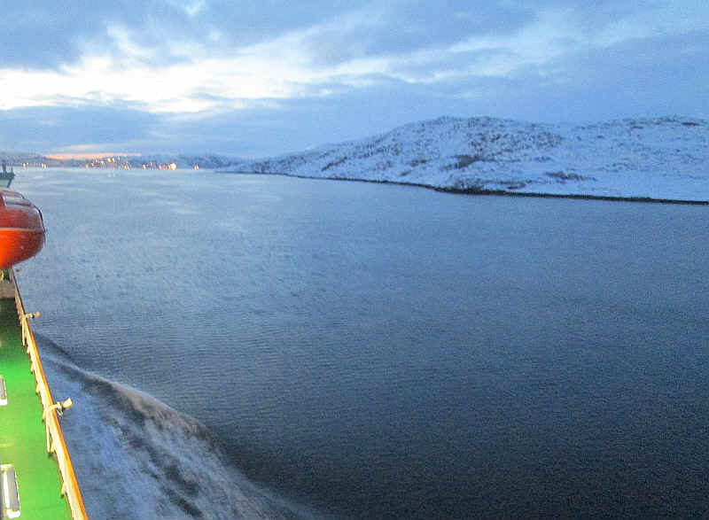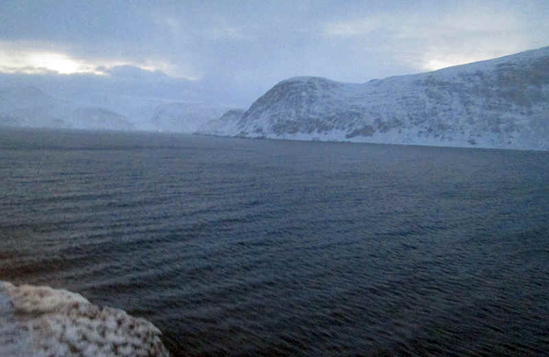 The arm of the fjord beyond the terminal is covered in ice. The hills in the far distance are across the Russian border which is only about 7 miles away.