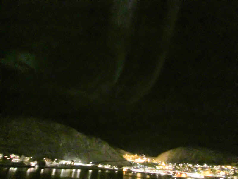 One of the features of the winter Hurtigruten ships is that you can receive a message in your cabin to tell you that the Northern Lights are visible. We did this on our first night and were duly woken about half past twelve. Like many other passengers we got dressed in our full winter clothing and headed up to the open deck to see......nothing except dark sky and stars. Either we didn't know what to look for or the lights had disappeared.