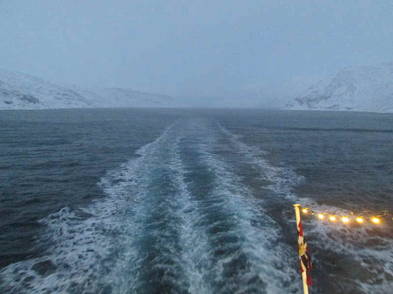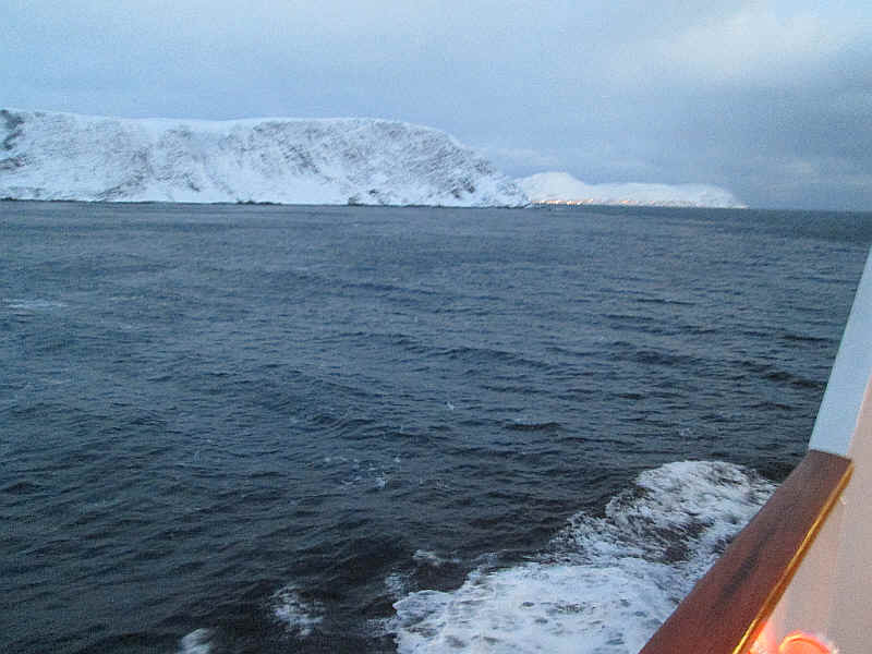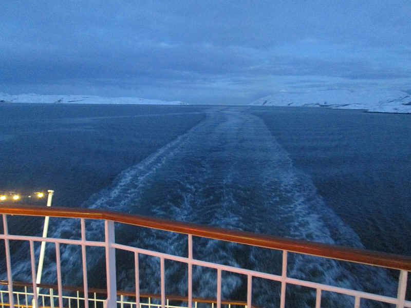 Looking back from the stern (the sun deck!) with the island of Magerøya on the right. This is the island with the Nord Kapp (North Cape) on it. The Nord Kapp is the most northerly point in Europe to which you can drive.