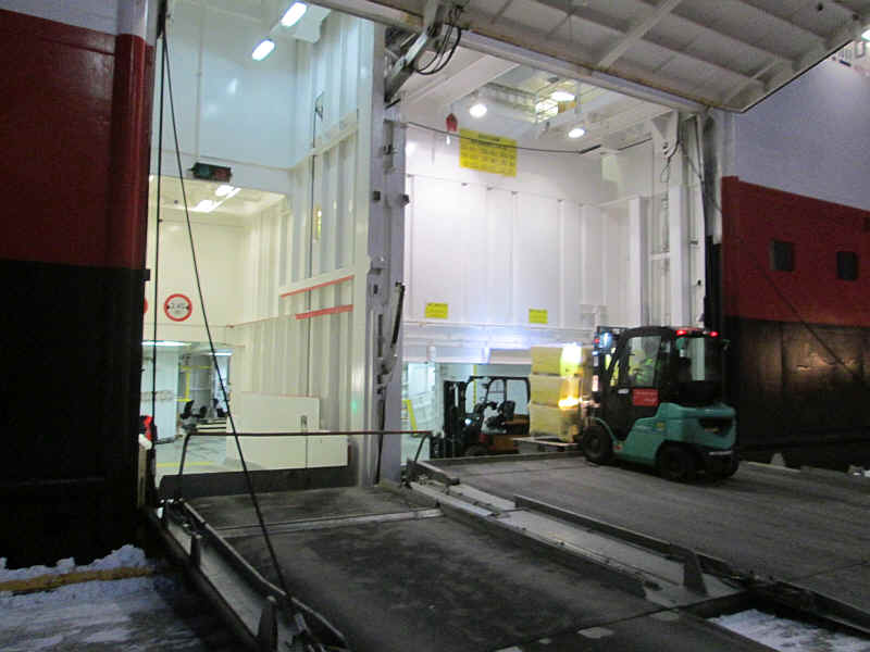 Later in the evening, at a quarter past eight, the cargo doors are going down at Mehamn as the fork lift truck gets ready for duty.