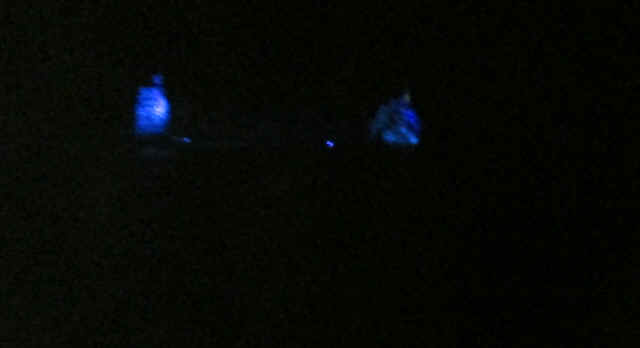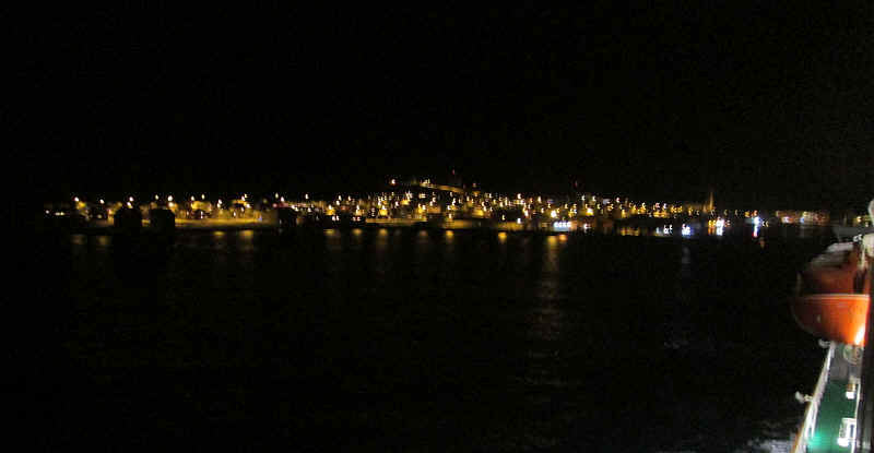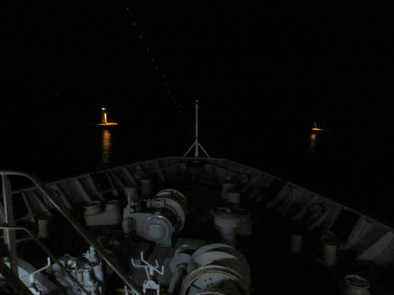 The ship heads out of the harbour between the two marker lights and into total darkness.