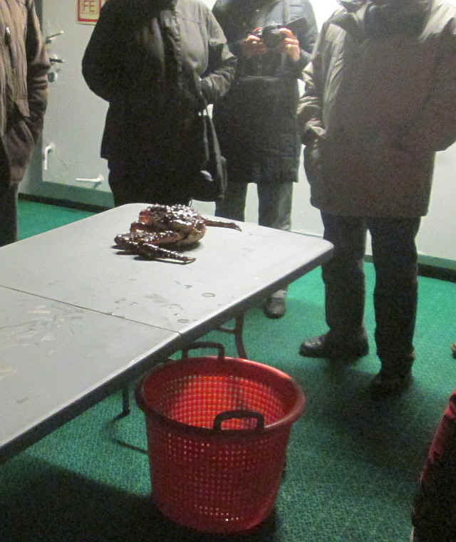 There had been some doubt about whether the next event would take place as the sea was still a little rough but some of the passengers assembled on the top deck to see a fishermen board the ship by rope ladder carrying some live king crabs. We got a lecture in perfect English from the fisherman about the problems these creatures are causing to fishermen along the Norwegian coast and how the bureaucrats in Oslo don't understand the seriousness of the situation.
