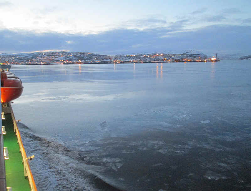 As the ship arrived at Kirkenes there was ice floating on the water. The outside temperature was -14 Celsius.