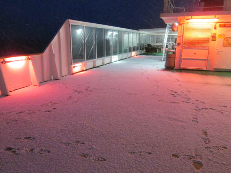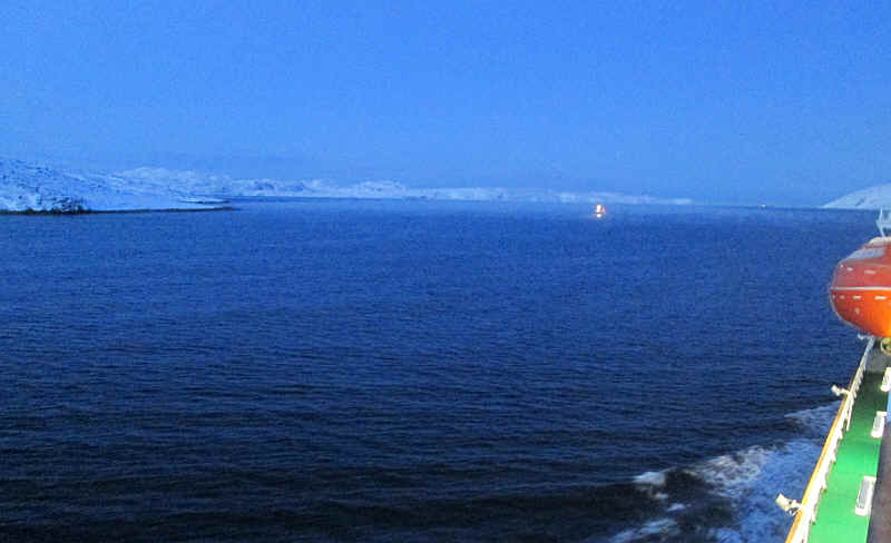 Later we both put on all our winter clothing and go and stand at the front of the ship. In the distance the sky is a yellowy orange - a shifting mass seen low down on the horizon or behind islands - so we presume this is one of the manifestations of the Northern Lights. It's a strange sensation to be out in the dark and wind in such a bleak environment.