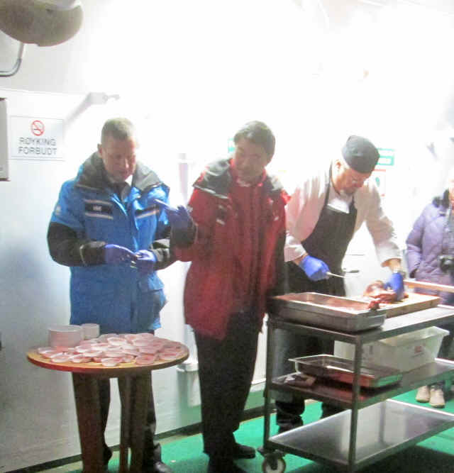 Later that afternoon we are invited on deck to see the chef preparing some reindeer meat for the evening's dinner. One of the officers goes around handing out reindeer salami which is rather pleasant.