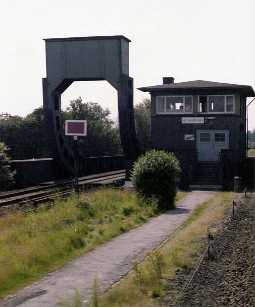 Lifting bridge over the canal just outside Wilhelmshaven at Mariensiel on the line to Sande. There are two bridges side by side herewith a signal box sandwiched between them.