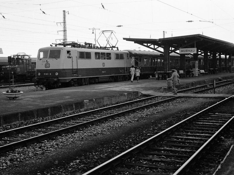 Back at Murnau 111061 ran in on a München to Garmisch-Partenkirchen train. In the background is 169002 another of the old Oberammergau branch locos which were still being used on freight trains.